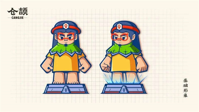 IP形象是以傳說中創(chuàng)造漢字的倉頡為創(chuàng)意原型,通過對其造型的系列化結(jié)構(gòu)設(shè)計與涂裝,體現(xiàn)漢字書體與對應(yīng)工具材料呈現(xiàn)載體的發(fā)展變化歷程,以及與之同時期的服飾與裝飾藝術(shù)特征。包括小倉頡主形象和穿越于不同漢字發(fā)展時代九個不同的形象設(shè)計,表現(xiàn)十種代表性書體與其相應(yīng)的工具材料載體,體現(xiàn)了漢字發(fā)展與科技進步的緊密關(guān)系。