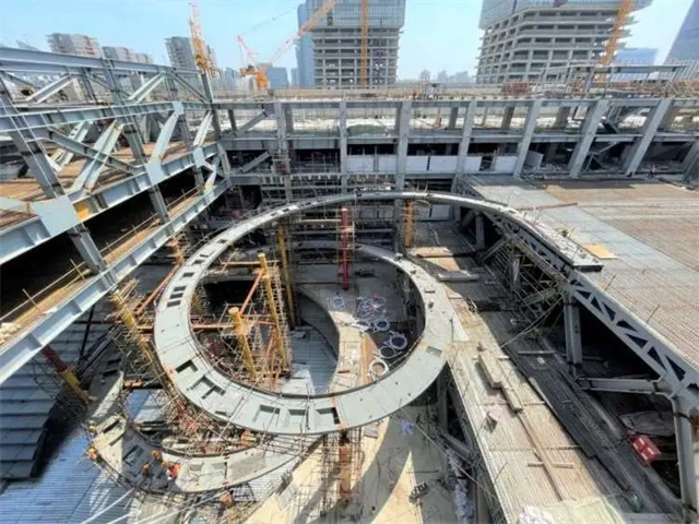 在單體內(nèi)部,有約200米長的旋轉(zhuǎn)坡道,重量約為280噸。面板、底板、橫隔板和內(nèi)隔板密集排列,焊接工作量巨大。在有限施工空間內(nèi),建設(shè)者們利用高空拼裝施工工藝,以吊索進行出裝預(yù)拼,再對吊索分批次分階段預(yù)應(yīng)力張拉,促使旋轉(zhuǎn)坡道完成最終受力體系轉(zhuǎn)換,完成拼接。