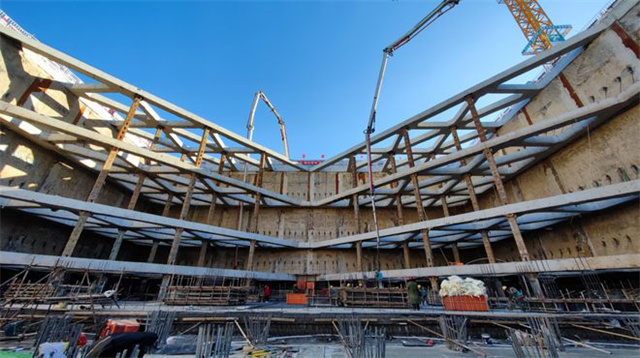 施工現(xiàn)場,已經(jīng)完成的主體結(jié)構(gòu)表面高低錯落,讓人感覺起伏多變,劉杰介紹,地面起伏多變其實是“反梁”工藝,是為了保證地下屋面的順滑流暢,將原本需要向下突出的橫梁改為向上突出,呈現(xiàn)出表面標高復雜的情況。由于未來地面僅有2000平方米的配套建筑,其余都是綠化景觀,“反梁”的設(shè)計既實現(xiàn)了地下效果最優(yōu),也避免影響地面景觀。
