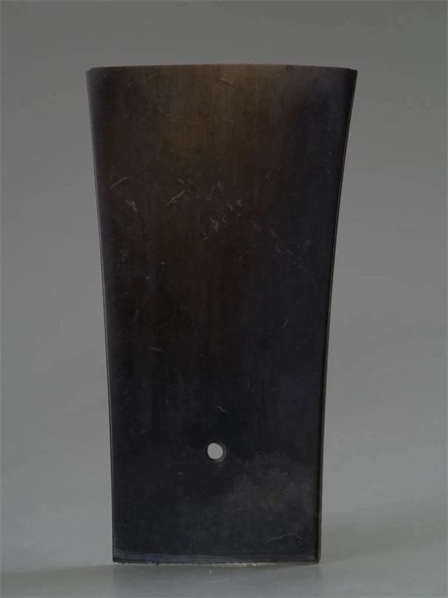其中,展出的一件玉鉞材質(zhì)是深綠色透閃石玉,最薄處的厚度僅為0.7毫米,是國內(nèi)目前已知“最薄的史前玉鉞”,充分體現(xiàn)了石峁玉器高超的切割打磨工藝,目前專家對于該玉鉞的加工方式尚無定論。玉鉞出現(xiàn)于新石器時代至商周時期。這類形狀似兵器的玉器,一般稱之為“玉兵”。在此時期,玉兵主要作為一種禮器,是彰顯軍權(quán)的象征物品,而并非用于砍殺的實用器。在石峁城墻中常有玉刀、玉鉞、玉鏟等薄片帶刃玉器,這就是考古界所說的“藏玉于墻”,葉舒憲先生認(rèn)為這種現(xiàn)象正是“瑤臺玉門”的表現(xiàn)。