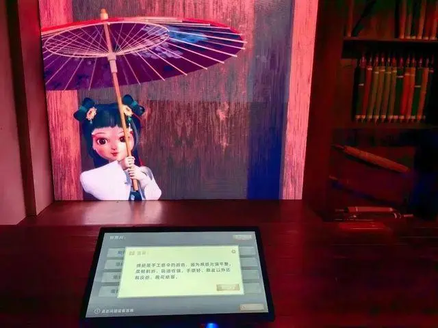 古街傘鋪在古街傘鋪場景處,設置了觸摸互動設備,關于傘的基本知識都呈現(xiàn)在桌面的顯示屏中,大家只需動動手指點一點,便可以與虛擬數(shù)字人物傘館代言人“婳傘”對話,了解更多關于傘的文化知識。