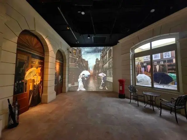 英國傘街二樓的傘街,復原了18世紀英國街區(qū)人們撐傘出行的動態(tài)場景及天氣的變換,展現(xiàn)了近代英國的傘文化、傘種類以及英國人對傘的喜愛。場景復原中還加入了3D油畫,以此提升畫面效果的真實性與體驗感。