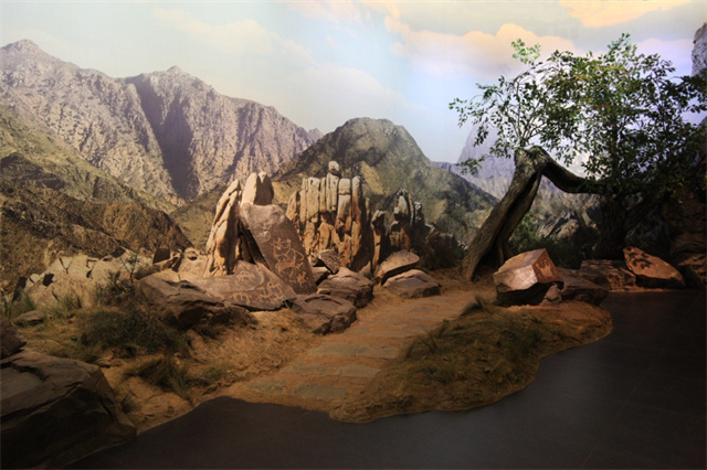 巖畫被史學(xué)界喻為“形象的語言,藝術(shù)的史詩”。巖畫作為包頭博物館的特色展品之一,記錄著古代北方游牧民族生產(chǎn)生活的點(diǎn)點(diǎn)滴滴,展現(xiàn)了北方游牧民族發(fā)展的艱辛歷程和連續(xù)篇章。包頭博物館努力為廣大觀眾營造沉浸式觀展體驗(yàn),巧妙利用原展廳空間和斜坡式屋頂?shù)奶攸c(diǎn),通過全景式立體展示的方式,營造出草原大漠神秘而幽遠(yuǎn)的氛圍,通過再現(xiàn)巖畫的生成環(huán)境,帶給觀眾身臨其境之感,使觀眾在“天人合一”的藝術(shù)意境中,感受回歸大自然的夢(mèng)幻感覺,體味巖畫的獨(dú)特藝術(shù),領(lǐng)略古代文明的魅力。